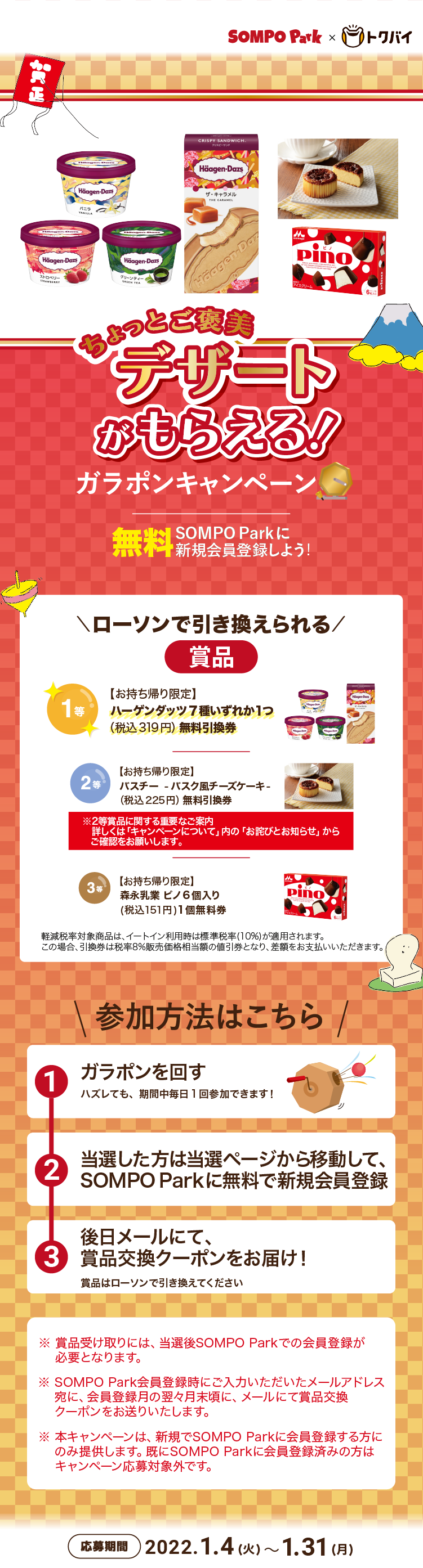 ※ 賞品は、SOMPO Park会員登録時にご入力いただいたメールアドレス 宛に、会員登録月の翌々月末頃に、メールにて賞品交換 クーポンをお送りいたします。